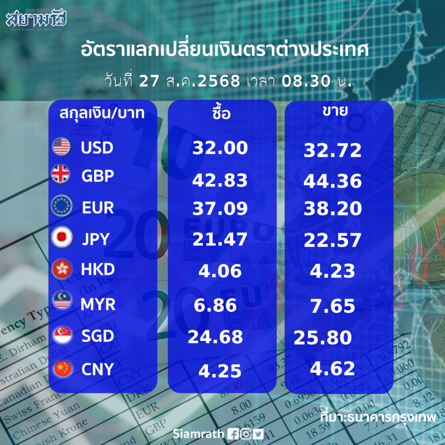 อัตราแลกเปลี่ยนเงินตราต่างประเทศวันนี้ (27 ส.ค.68)