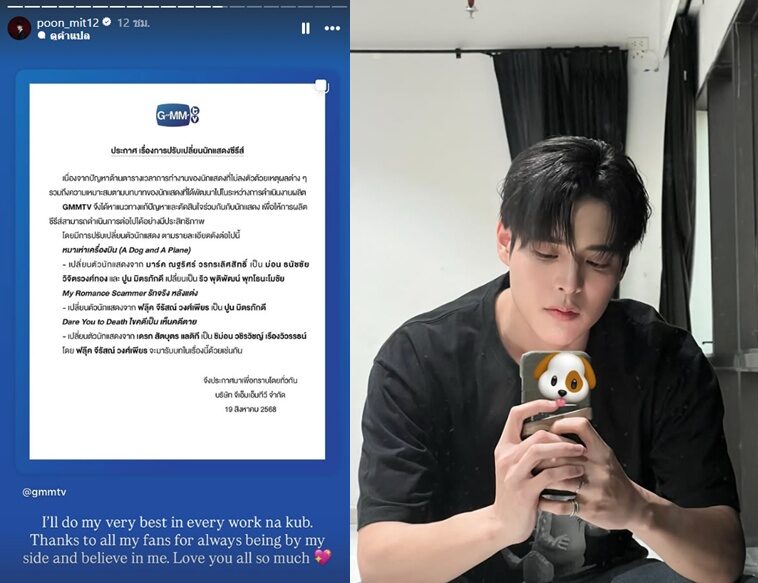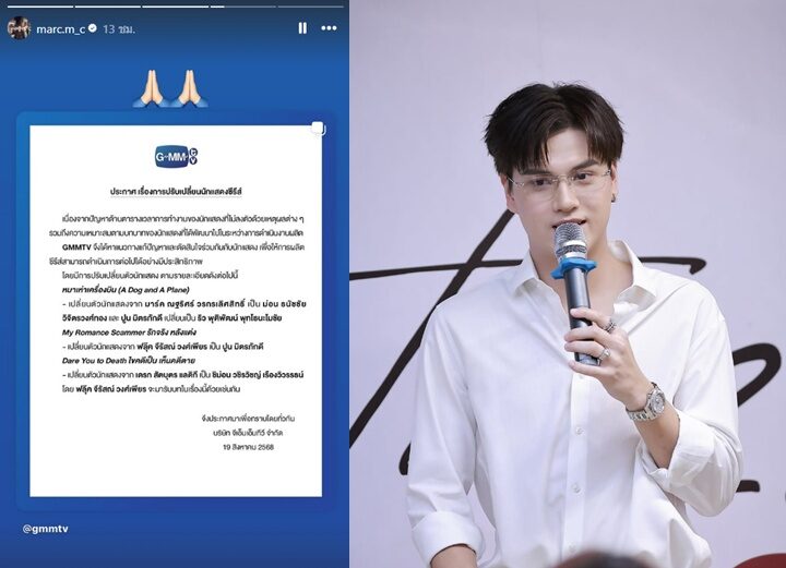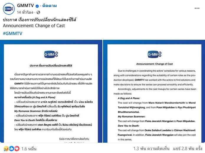 จากกรณี GMMTV ออกประกาศแจ้งว่า“ประกาศ เรื่องการปรับเปลี่ยนนักแสดงซีรีส์