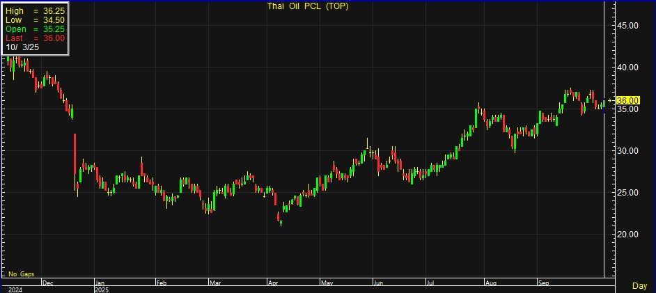 อัพเดต 03 ต.ค. 2568 เวลา 08.20 น. • เผยแพร่ 03 ต.ค. 2568 เวลา 08.16 น. • ข่าวหุ้นธุรกิจออนไลน์ผู้สื่อข่าวรายงานว่า วันนี้ (3 ต.ค.68) ราคาหุ้นบริษัท ไทยออยล์ จำกัด (มหาชน) หรือ TOP ณ เวลา 15:00 น. อยู่ที่ระดับ 36 บาท บวก 0.50 บาท หรือ 1.41% สูงสุดที่ระดับ 36.25 บาท ต่ำสุดที่ระดับ 34.50 บาท ด้วยมูลค่าการซื้อขาย 340.43 ล้านบาท
