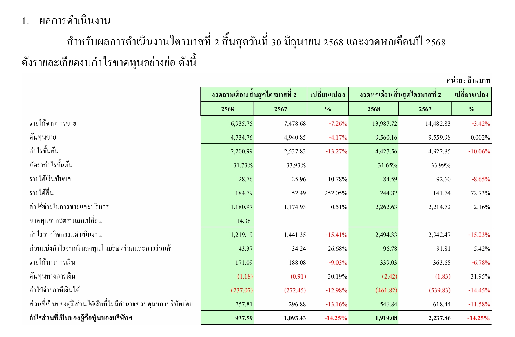 บริษัท ไทยเพรซิเดนท์ฟูดส์ จำกัด (มหาชน) (TFMAMA) เปิดเผยผลประกอบการไตรมาส 2 ปี 2568 โดยบริษัทมีรายได้จากการขาย 6,935.75 ล้านบาท ลดลง 7.26% จากช่วงเดียวกันของปี 2567 และมียอดขายช่วงครึ่งแรกของปี 2568 อยู่ที่ 13,987.72 ล้านบาท ลดลง 3.42% จากช่วงเดียวกันของปีก่อน