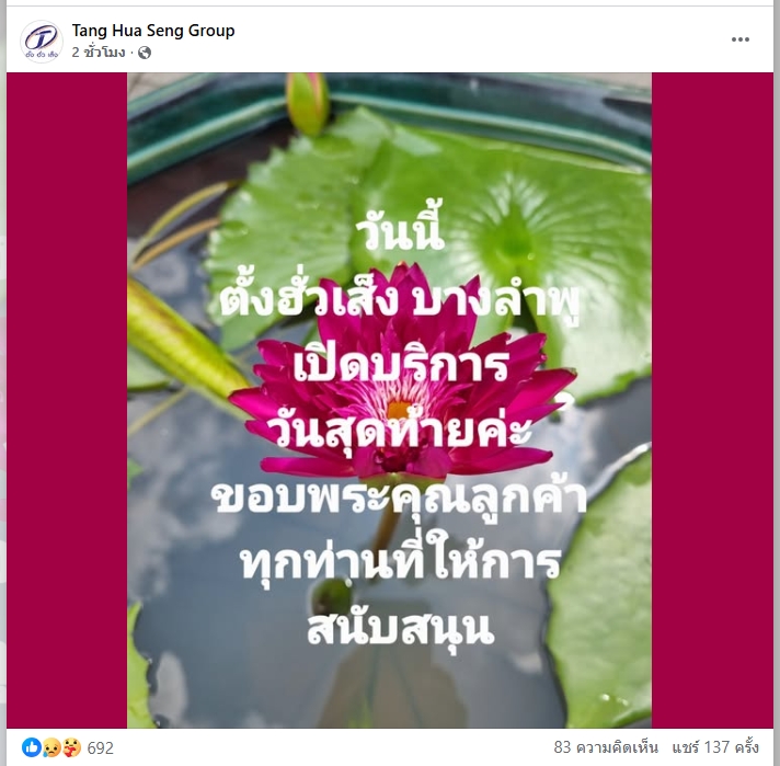 ผู้สื่อข่าวรายงานว่า ตั้งฮั่วเส็ง แบรนด์ค้าปลีกสรรพสินค้าของไทย ประกาศผ่านเฟซบุ๊กแฟนเพจ Tang Hua Seng Group โดยระบุว่า “วันนี้ (20 พ.ย. 68) ตั้งฮั่วเส็ง บางลำพู เปิดบริการวันสุดท้าย ขอบพระคุณลูกค้าทุกท่านที่ให้การสนับสนุน”
