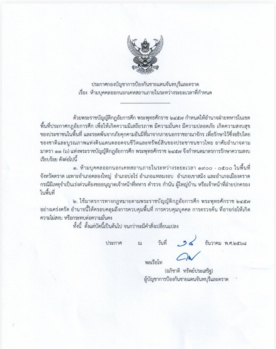 1.ห้ามบุคคลออกนอกเคหสถานภายในระหว่างระยะเวลา 19.00 น.- 05.00 น.ในพื้นที่ จังหวัดตราด เฉพาะอำเภอคลองใหญ่ อำเภอบ่อไร่ อำเภอแหลมงอบ อำเภอเขาสมิง และ อำเภอเมืองตราด กรณีมีเหตุจำเป็นเร่งด่วนต้องขออนุญาตเจ้าหน้าที่ทหาร ตำรวจ กำนัน ผู้ใหญ่บ้าน หรือเจ้าหน้าที่ฝ่ายปกครอ ในพื้นที่
