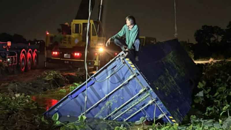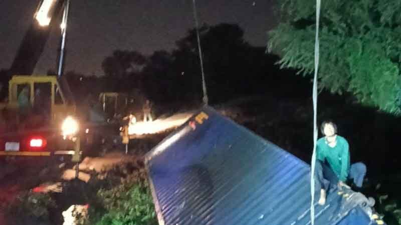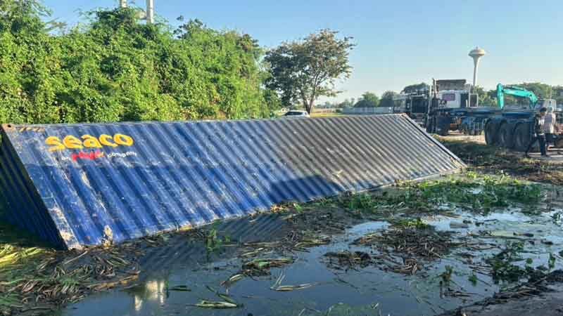 โดยวานนี้ เวลาประมาณ 09.00 น. พนักงานขับรถเทรลเลอร์ซึ่งขับตามระบบ GPS ไม่คุ้นเส้นทางมาถึงจุดเกิดเหตุ ซึ่งเป็นถนนลูกรังคดโค้งและมีคูส่งน้ำข้างทางทำให้ไม่สามารถควบคุมรถได้จึงเกิดอุบัติเหตุตกคูส่งน้ำทำให้ตู้คอนเทนเนอร์จมลงไปประมาณกว่า 90%