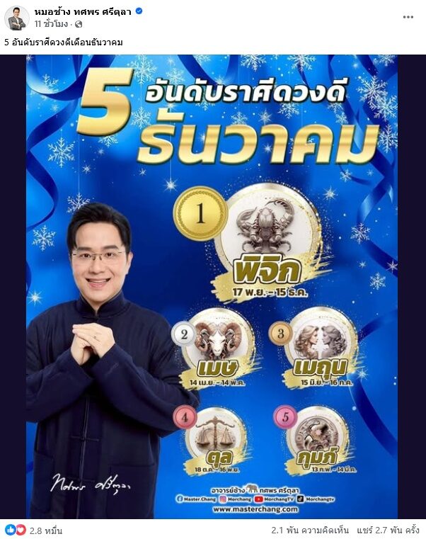 อ่านข่าวต้นฉบับได้ที่ : ปิดท้ายปีด้วยความปัง หมอช้าง เปิด 5 ราศีดวงดีเดือนธันวาคม
