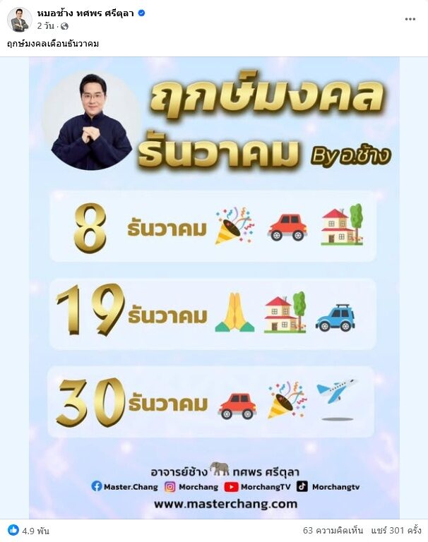 หมอช้าง ยังเผยถึง “ฤกษ์มงคลเดือนธันวาคม” ดังนี้