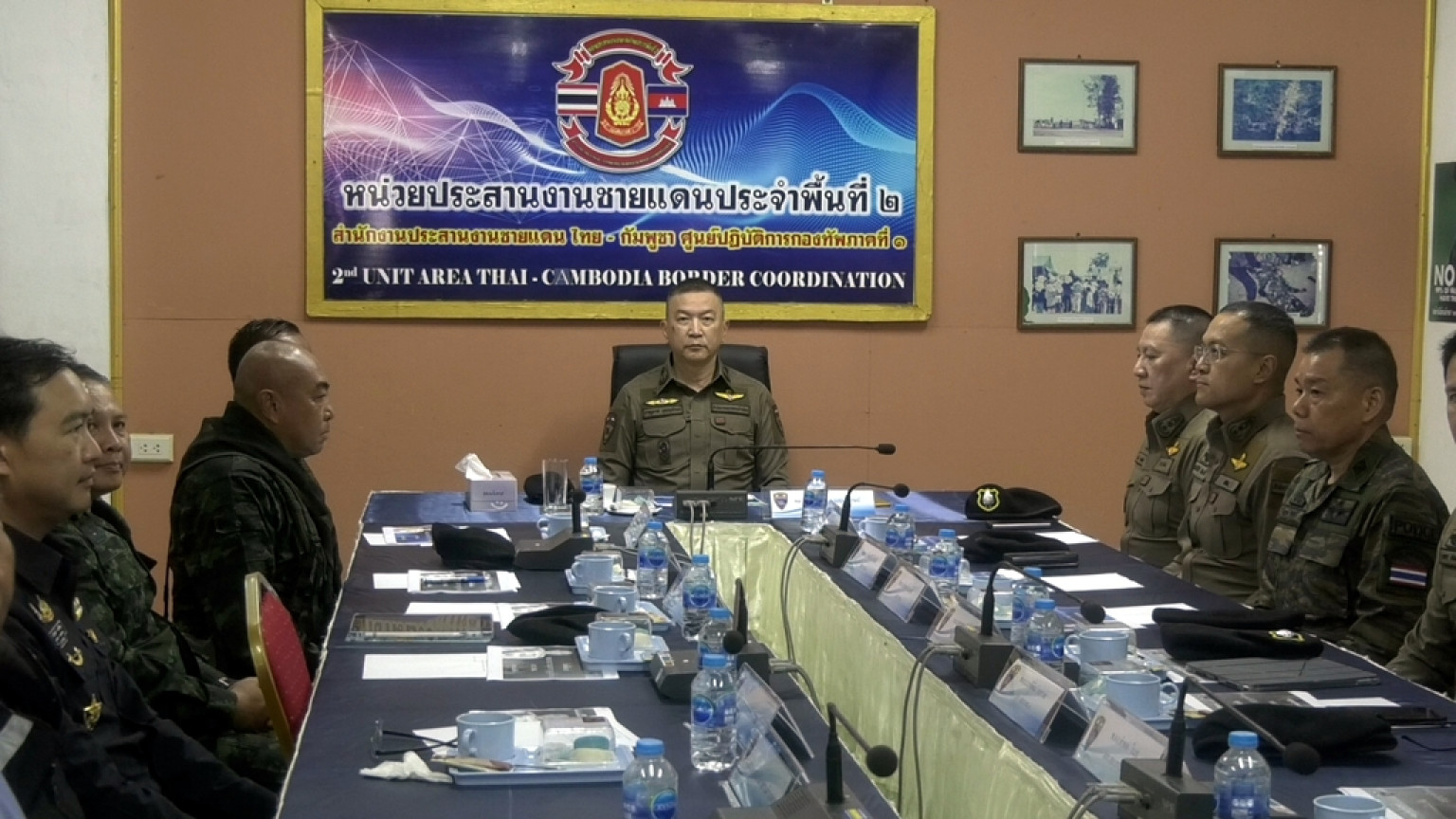 วันที่ 3 ก.ค.68 ที่จุดผ่านแดนถาวรช่องจอม ต.ด่าน อ.กาบเชิง จ.สุรินทร์ พล.ต.ท.ภาณุมาศ บุญญลักษม์ ผู้บัญชาการสำนักงานตรวจคนเข้าเมือง ได้เดินทางมาตรวจเยี่ยมและมอบสิ่งของบำรุงขวัญแก่ข้าราชการตำรวจ ในสังกัด ตรวจคนเข้าเมือง จ.สุรินทร์ พร้อมร่วมประชุมร่วมกับ พันเอก ภาคภูมิ นภากาศ ผู้บังคับหน่วยเฉพาะกิจที่ 2 ผู้แทนจากกองกำลังสุรนารี,นายสุทธิโรจน์ เจริญธนะศักดิ์ นายอำเภอกาบเชิง ,พล.ต.อ.คำพล โนนุช ผกก.สภ.กาบเชิงฯ,นายศิริชัย ตันติรัตนานนท์ นายก อบต.ด่าน.และหน่วยงานในพื้นที่ที่เกี่ยวข้อง โดยมี พ.ต.อ.ชัชชัย สำเนียง ผกก.ตม.จว.สุรินทร์ เป็นผู้กล่าวรายงานสถานการณ์แรงงานต่างด้าวในพื้นที่ และ เพื่อรับทราบสถานการณ์ชายแดนในพื้นที่จากหน่วยงานที่เกี่ยวข้องต่างๆ ภายห้องประชุมศูนย์ประสานงานพื้นที่ชายแดนไทย-กัมพูชา หน้าจุดผ่านแดนถาวรช่องจอม