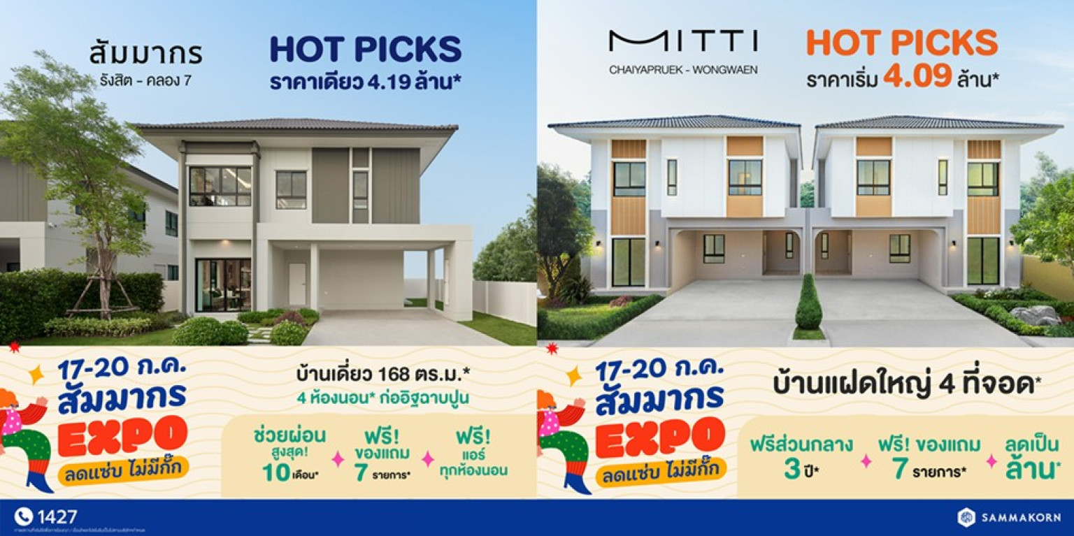 เตรียมตัวให้พร้อม! กับโปรโมชันอสังหาฯ สุดแซ่บ ส่งตรงจากบริษัท สัมมากร จำกัด (มหาชน) ในแคมเปญลดยิ่งใหญ่แห่งปี “สัมมากร EXPO ลดแซ่บ ไม่มีกั๊ก!” งานนี้ขนโปรฯ เด็ดโดนใจมาเพียบ! จัดเต็มส่วนลดสูงสุดถึง 9,000,000 บาท* ช่วยผ่อนนานสูงสุด 60 เดือน* พบกันที่ทุกโครงการคุณภาพจากสัมมากร ระหว่างวันที่ 17-20 กรกฎาคม 2568 นี้เท่านั้น เพราะสัมมากรเข้าใจดีว่าการมีบ้านสักหลังในยุคนี้ไม่ใช่แค่เรื่องของการอยู่อาศัย แต่คือการลงทุนครั้งสำคัญเพื่อยกระดับคุณภาพชีวิต สัมมากรจึงขอจัดเต็มแบบไม่มีกั๊ก รวบรวม 11 โครงการคุณภาพ ในทุกทำเลศักยภาพทั่วกรุงเทพฯและปริมณฑลมาให้เลือกสรรตั้งแต่บ้านเดี่ยว บ้านแฝด ทาวน์โฮม ไปจนถึงโครงการบ้านลักชัวรี ราคาเริ่มต้น 3.59 ล้านบาท ไปจนถึง 105 ล้านบาท* เพื่อให้ลูกค้าเป็นเจ้าของบ้านคุณภาพได้ง่ายยิ่งขึ้น