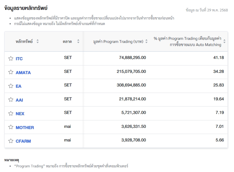 นอกจากนี้ ตลท.ยังรายงานข้อมูลหลักทรัพย์ที่ใช้ Program Trading ซื้อขายสูงสุด 7 อันดับ โดยเรียงจากเปอร์เซ็นต์ (%) มูลค่า Program Trading เทียบกับมูลค่าการซื้อขายแบบ Auto Matching ดังนี้