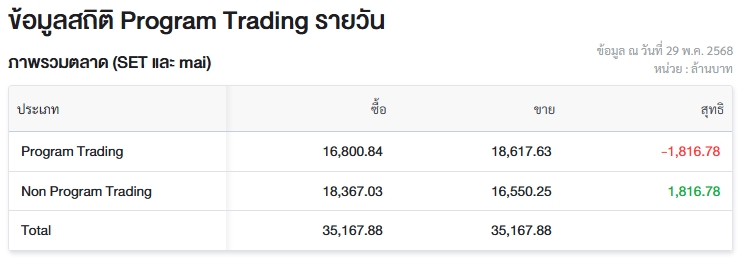 ขณะที่มูลค่าซื้อขายรายวันผ่าน Non Program Trading หรือ “การซื้อขายที่ไม่ใช่โปรแกรม” มีมูลค่าซื้อจำนวน 18,367.03 ล้านบาท และมูลค่าขายจำนวน 16,550.25 ล้านบาท เท่ากับซื้อสุทธิ 1,816.78 ล้านบาท