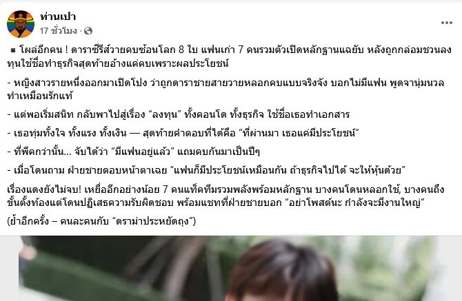 - แต่พอเริ่มสนิท กลับพาไปสู่เรื่อง “ลงทุน” ทั้งคอนโด ทั้งธุรกิจ ใช้ชื่อเธอทำเอกสาร