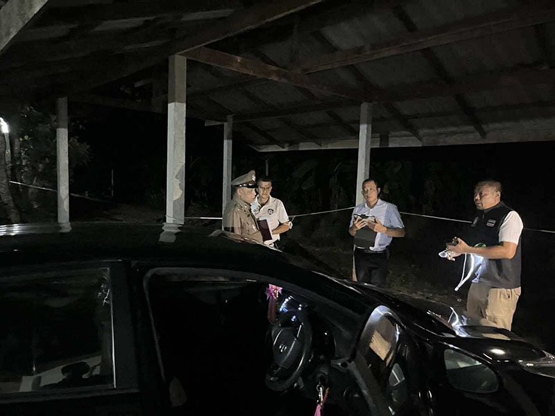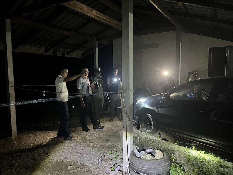 ห่างออกไปพบรถเก๋งยี่ห้อโตโยต้า รุ่นยาริส สีดำ ทะเบียน ขข 3035 สุราษฎร์ธานี เสียหลักชนกับเสาโรงจอดรถข้างบ้าน ที่กระจกด้านหน้าฝั่งคนขับมีรอยกระสุนทะลุกระจก 1 นัด เจ้าหน้าที่จึงเก็บไว้เป็นหลักฐาน