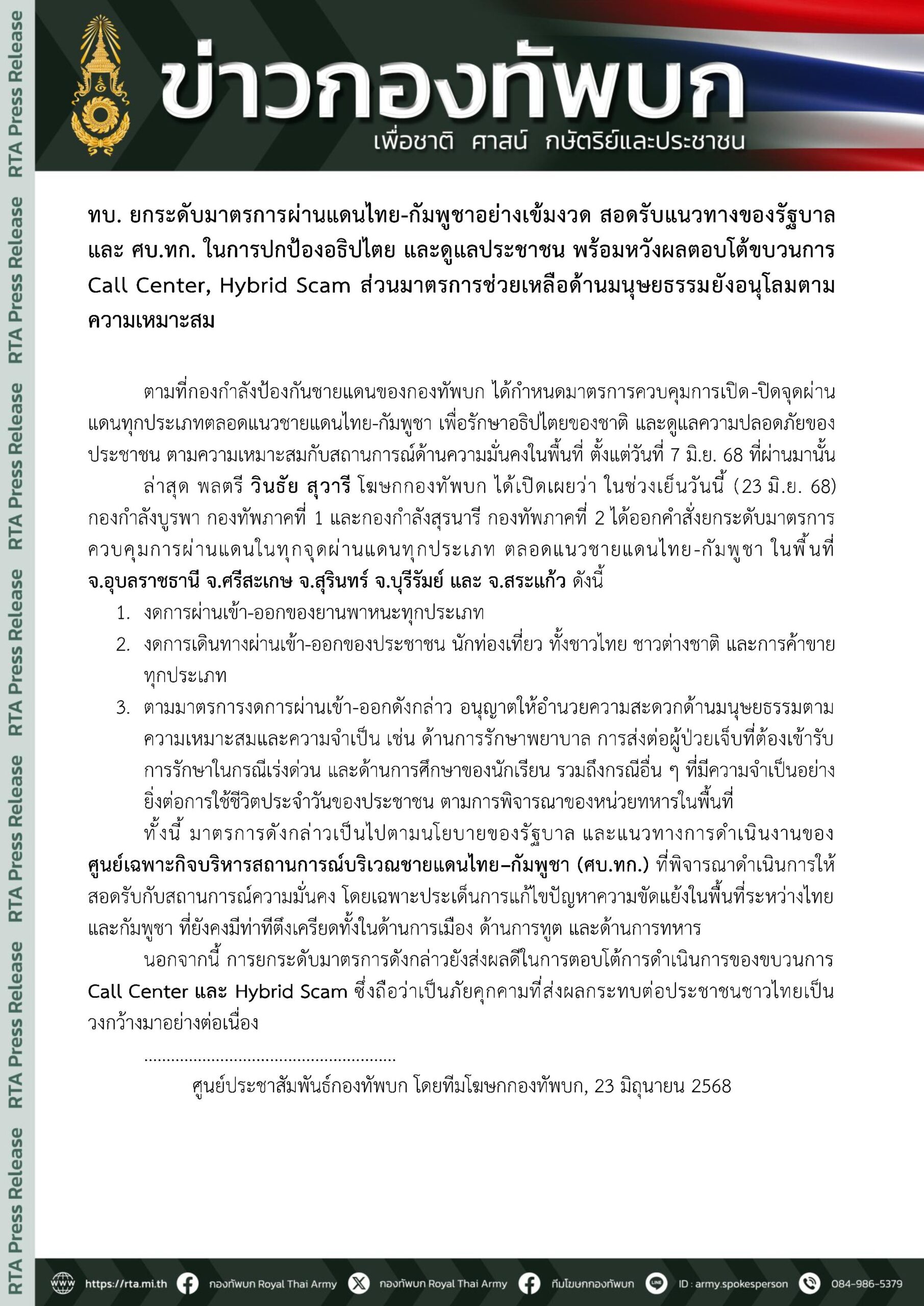 กองทัพ ปิดด่านครบ 7 จังหวัดแล้ว! ตลอดแนวชายแดน ไทย-กัมพูชา ยกระดับมาตรการ ตอบโต้แก๊งคอลเซ็นเตอร์ ไฮบริดสแกม คุกคามชาวไทย