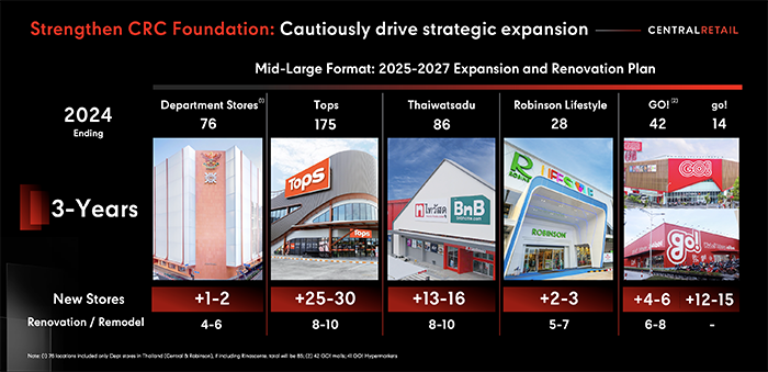 3. Expedite New Growth เร่งสร้างการเติบโตให้กับ New Growth Engine ของเซ็นทรัล รีเทล ผ่านการขยาย GO WHOLESALE ด้วย 5 กลยุทธ์สำคัญ ได้แก่ การขยาย Private Labels, ก้าวสู่การเป็น HORECA Destination สำหรับกลุ่มธุรกิจอาหาร, เป็นผู้นำเรื่องของสด (Always Fresh-Forward), ขยายสาขาอีกกว่า 12-18 สาขา ภายใน 3 ปี และการพัฒนา New Store Concept และ Fulfillment Store ให้เหมาะกับกลุ่ม HORECA และค้าปลีกอาหาร นอกจากนี้ยังเดินหน้าขยายเครือข่ายธุรกิจของ Auto1 ศูนย์บริการและจำหน่ายอุปกรณ์รถยนต์ครบวงจร ด้วยการเร่งเปิดสาขาเพิ่มไม่ต่ำกว่า 10 สาขาต่อปี ให้ครอบคลุมในทำเลศักยภาพ