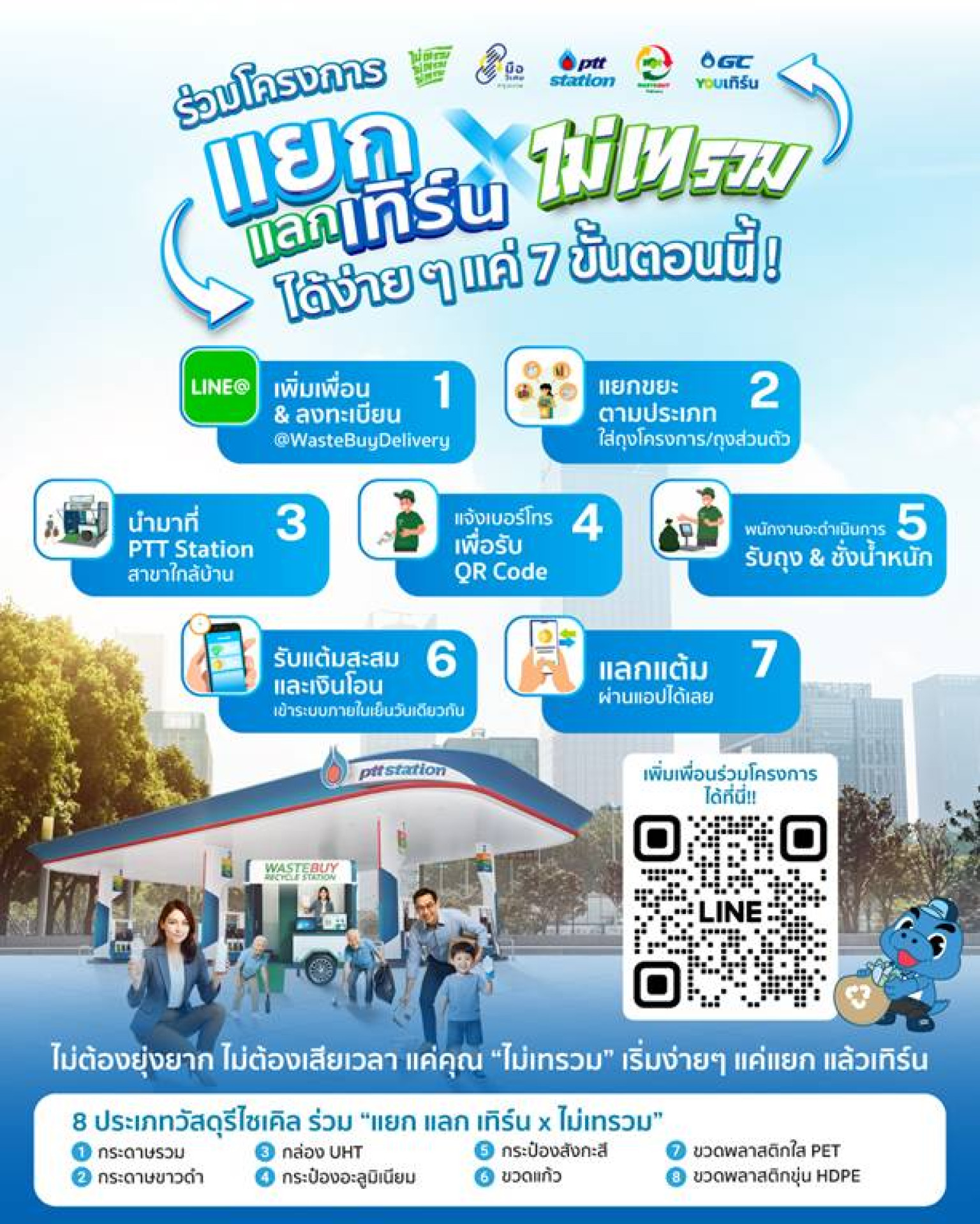 เปิดจุดรับวัสดุรีไซเคิล 8 ประเภท ได้แก่ กระดาษรวม กระดาษขาวดำ กล่อง UHT กระป๋องอะลูมิเนียม กระป๋องสังกะสี ขวดแก้ว ขวดพลาสติกใส PET ขวดพลาสติกขุ่น HDPE ณ สถานีบริการ พีทีที สเตชั่น จำนวน 10 สาขา ทั่วกรุงเทพมหานคร สอดรับวิถีชีวิตคนเมือง และลดปริมาณก๊าซเรือนกระจกอย่างเป็นรูปธรรม โดยประชาชนสามารถนำขยะที่แยกแล้วมาฝากได้ง่าย ๆ ผ่านระบบ BKK WASTE PAY ที่เชื่อมโยงกับแอปของกรุงเทพมหานคร เพื่อสะสมแต้มแลกรางวัล