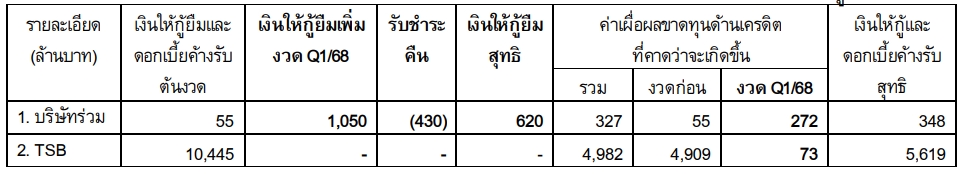 1.ค่าเผื่อผลขาดทุนด้านเครดิตที่คาดว่าจะเกิดขึ้น (ค่าเผื่อฯ) 272 ล้านบาท สําหรับให้เงินกู้ยืมกับบริษัทร่วม (44% ของ เงินให้เงินกู้ยืมสุทธิ) ซึ่งบริษัทให้กู้ยืมในไตรมาสที่ 1 นี้