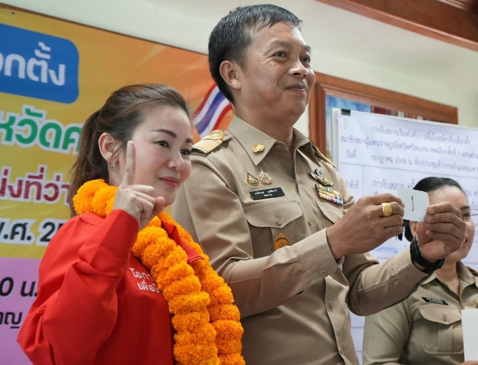 ผอ.กกต.เขต ได้ทำตามระเบียบ คือให้ ทั้ง 2 สาว ตกลงกัน แต่ตกลงกันไม่ได้ จึงได้ทำสลากขึ้นมา 2 ใบ โดยให้ใบแรกเป็นการจับชื่อของผู้สมัครที่จะมีสิทธิเข้าไปจับหมายเลขลำดับที่จะเข้าสมัคร และหากไม่มีอะไรผิดพลาดก็จะถือเป็นหมายเลขประจำตัวผู้สมัคร เมื่อจับสลากได้แล้วก็เริ่มออกหาเสียงทันที ผลจากการจับเบอร์ปรากฏว่า น.ส.ภูริกา สมหมาย พรรคเพื่อไทย จับได้หมายเลข 1 น.ส.จินณ์ตวรรณ ไตรสรณกุล พรรคภูมิใจไทย จับได้หมายเลข 2 ท่ามกลางเสียงปรบมือจากประชาชนที่มาร่วมให้กำลังใจแน่นขนัด และมีกองเชียร์ต่างชูหมายเลขของทั้งสองฝ่ายเพื่อหาเสียงทันที
