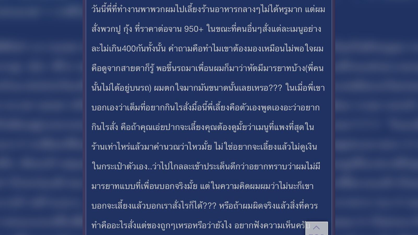 หนุ่มสงสัย พี่ที่ทำงานอาสาเลี้ยงข้าว คนอื่นสั่ง 400 บาท แต่เขาสั่งราคา 900 โดนเพื่อนด่าไม่มีมารยาท สุดงง ไหนบอกจะเลี้ยง สั่งของแพง มันผิดมากหรือ?