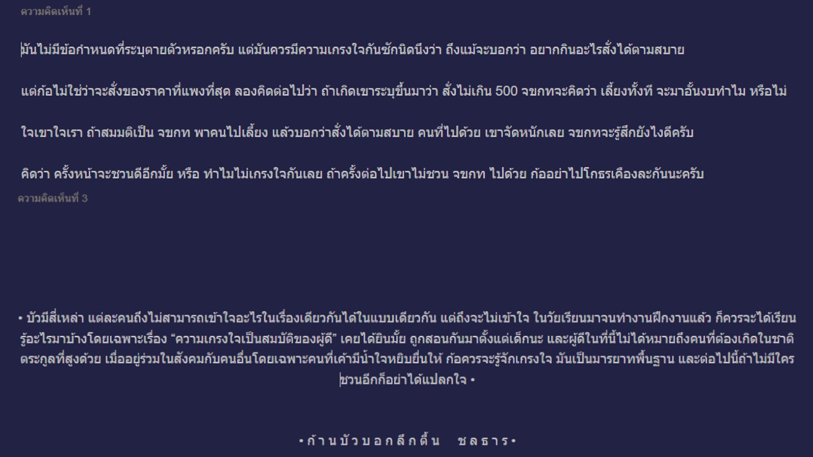 พอขึ้นรถเพื่อนก็เตือนเขาว่า"หัดมีมารยาทบ้าง" ซึ่งเขาตกใจมากว่ามันขนาดนั้นเชียวหรือ ในเมื่อรุ่นพี่พูดเองว่าอยากทานอะไรก็สั่งเลย ซึ่งเขามองว่าถ้าเอ่ยปากเลี้ยงแล้ว คนที่พูดต้องเช็กด้วยว่าเมนูที่แพงที่สุดในร้านราคาเท่าไหร่และจ่ายไหวไหม ไม่ใช่ว่าจะเลี้ยงแล้วไม่ดูเงินในกระเป๋าตัวเอง