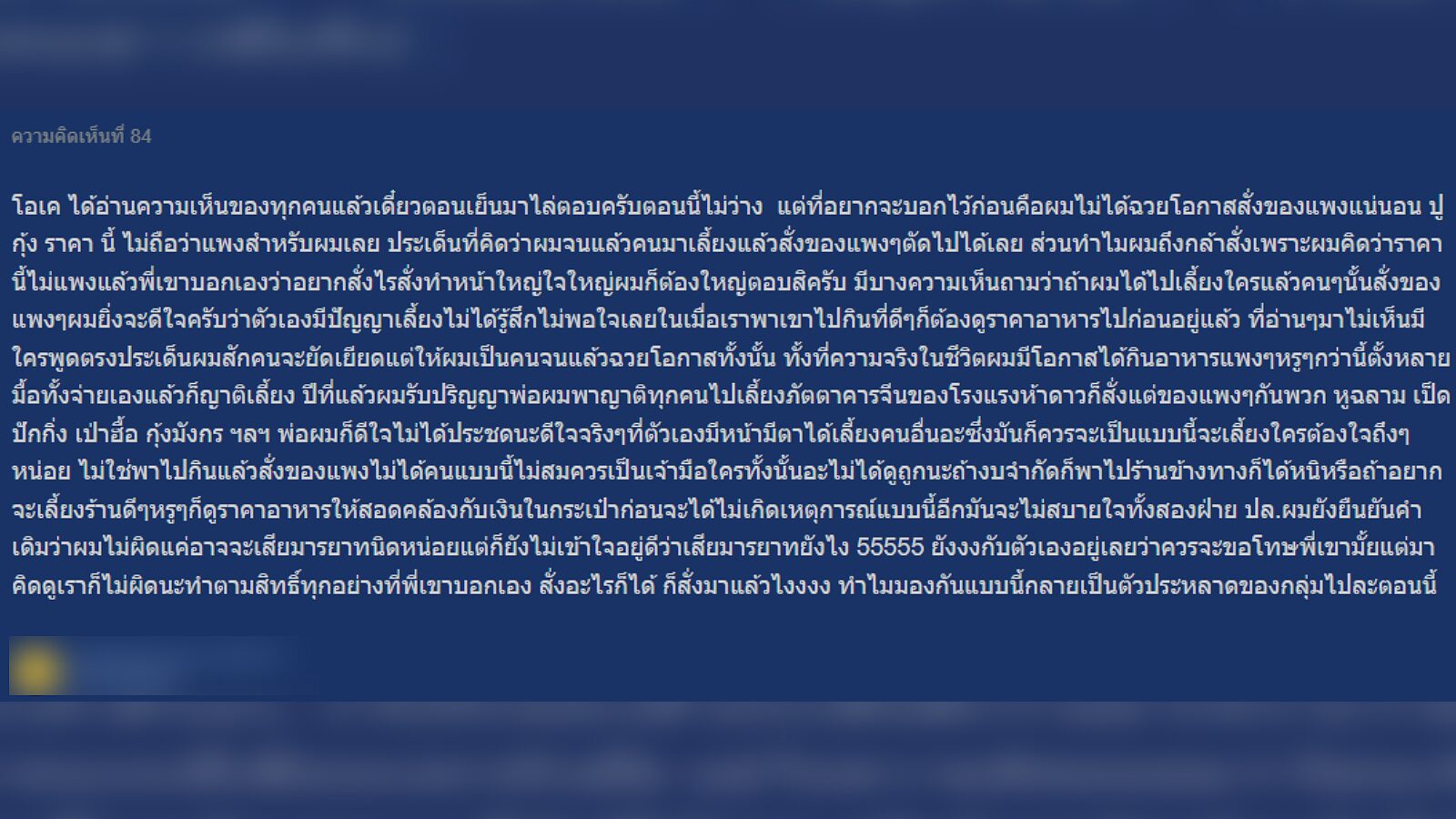 หลายคนกล่าวหาว่าเขาฉวยโอกาส ทั้ง ๆ ที่ในชีวิตจริง เขามีโอกาสได้ทานอาหารแพงกว่านี้ตั้งหลายมื้อ ทั้งจ่ายเองแล้วก็ญาติเลี้ยง ซึ่งเขาดีใจจริง ๆ ที่มีหน้ามีตาได้เลี้ยงคนอื่น ถ้าจะเลี้ยงใครต้องใจถึงสักนิด ถ้าอยากจะเลี้ยงร้านดี ๆ ก็ควรดูราคาอาหารให้สอดคล้องกับเงินในกระเป๋าก่อน จะได้ไม่เกิดเหตุการณ์แบบนี้อีก