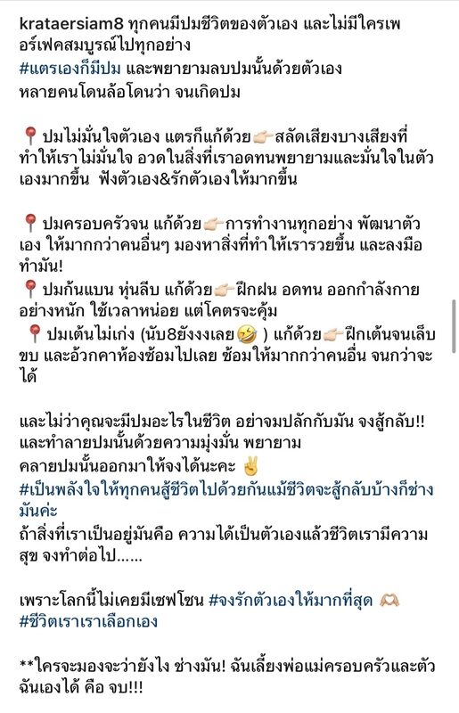 “#เป็นพลังใจให้ทุกคนสู้ชีวิตไปด้วยกันแม้ชีวิตจะสู้กลับบ้างก็ช่างมันค่ะ ถ้าสิ่งที่เราเป็นอยู่มันคือ ความได้เป็นตัวเองแล้วชีวิตเรามีความสุข จงทำต่อไป…เพราะโลกนี้ไม่เคยมีเซฟโซน #จงรักตัวเองให้มากที่สุด #ชีวิตเราเราเลือกเอง **ใครจะมองจะว่ายังไง ช่างมัน! ฉันเลี้ยงพ่อแม่ครอบครัวและตัวฉันเองได้ คือ จบ!!!”