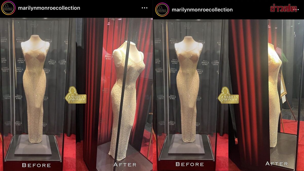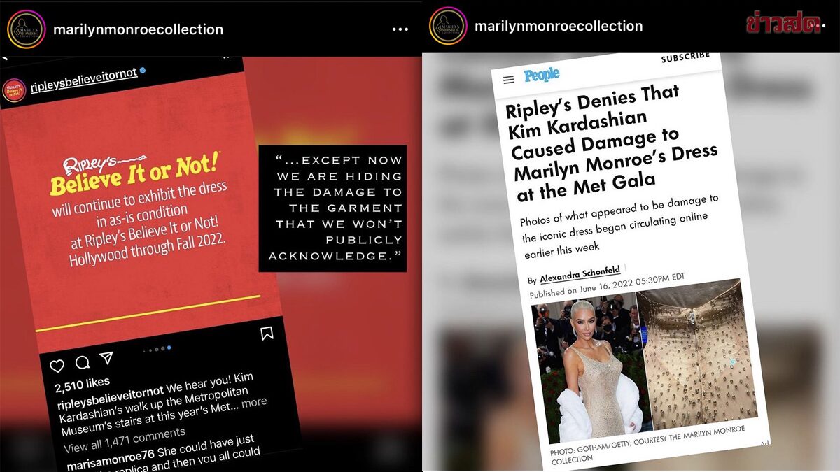 โดยบัญชีดังกล่าวแนบภาพพร้อมอธิบายเพิ่มเติมว่า ทางพิพิธภัณฑ์ Ripley's Believe It or Not! กำลังปกปิดด้านหลังและด้านข้าง ของชุดอันโด่งดังนี้จากสายตาของสาธารณชน แม้ว่าทางพิพิธภัณฑ์จะยืนยันซ้ำแล้วซ้ำอีกว่า ชุดดังกล่าวไม่ได้รับความเสียหายใดๆ หลังจากที่ 'คิม' นำไปสวมใส่ออกงาน Met Gala ปี 2022