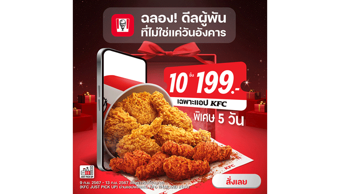 สำหรับแฟนๆ ทุกคน KFC ขอมอบคำขอบคุณผ่านโปรโมชันสุดคุ้มที่ให้ทุกคนได้มาร่วมฉลองด้วยกันอย่างเต็มที่ ด้วยแคมเปญฉลองวันเกิดผู้พันที่ไม่ว่าเป็นใคร ผู้พันก็พร้อมให้ฟรี! ไก่ทอด 1 ชิ้น เมื่อสั่งบักเก็ตไก่ 199 บาทขึ้นไป (ไม่ร่วมโปรโมชันกับการสั่งผ่านแอปพลิเคชันเดลิเวอรีอื่น) ตั้งแต่วันที่ 29 สิงหาคม - 25 กันยายน 2567 เท่านั้น ยังไม่หมดแค่นี้! พิเศษสุดๆ เพื่อฉลองวันเกิดผู้พันแซนเดอร์ส เอาใจแฟนๆ สาวกดีลผู้พันวันอังคาร ที่ตอนนี้จะไม่ได้มีแค่วันอังคารอีกต่อไป เพราะถ้าสั่งผ่านแอป KFC ทุกคนสามารถซื้อไก่ 10 ชิ้นได้ในราคา 199 บาท ตลอด 5 วัน ตั้งแต่ วันที่ 9 - 13 กันยายน 2567 และยังมีโปรโมชันสุดคุ้มประจำสัปดาห์ที่ KFC ส่งให้ฟรีทุกออเดอร์ที่มีราคา 350 บาทขึ้นไป ให้ทุกคนได้อร่อยกับ KFC แบบคุ้มๆ กันทั้งเดือน