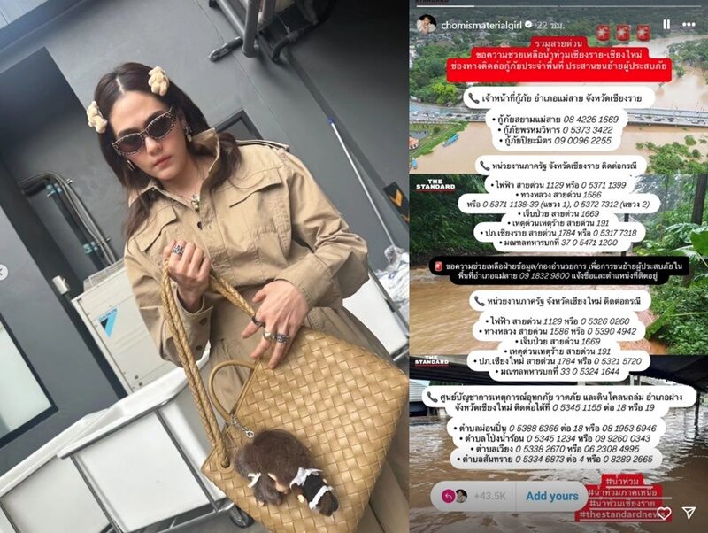 ขณะที่ สาวชมพู่ ล่าสุดก็โพสต์แชร์สายด่วนช่วยเหลือน้ำท่วม ลงในไอจี เช่นเดียวกันกับเพื่อนๆหลายคนบันเทิงช่วยกันโพสต์เช่นกัน