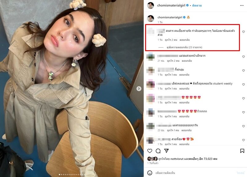 แต่ปรากฏมีคอมเมนต์จุดกระแสดราม่าโผล่ถามแซะกลางไอจีว่า “สงสาร คนเชียงรายจัง กำลังอดๆอยากๆ ไม่ต้องมานั่งแต่งตัวสวย” งานนี้ก็มีคอมเมนต์เข้ามาช่วยฟาดกลับกันรัวๆเดือดระอุ อาทิ