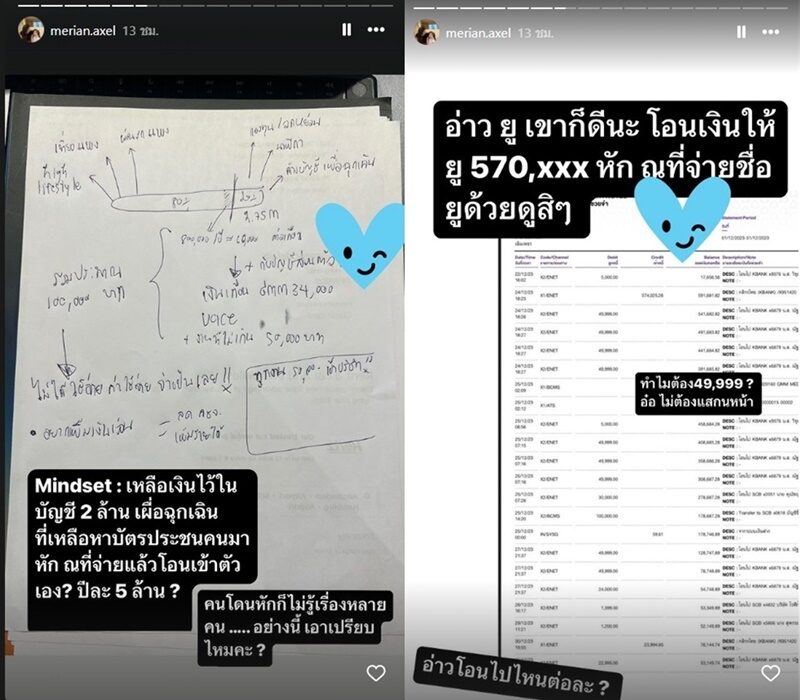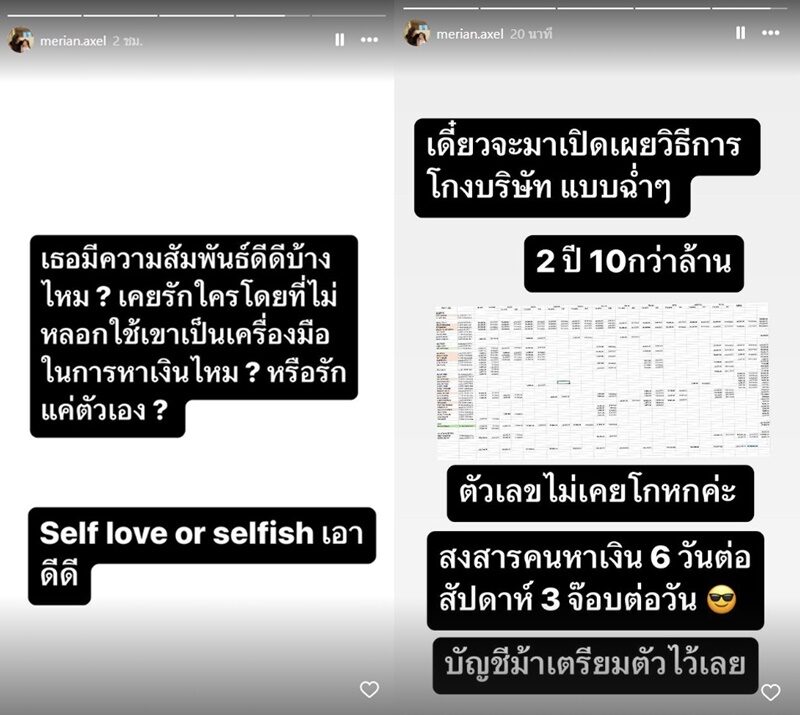 พร้อมทั้งโพสต์หลักฐานบัญชีเงิน ต่างๆ และยังตั้งคำถามอีกว่า บัญชีเงิน 2 ล้าน เผื่อฉุกเฉินที่เหลือหาบัตรประชาชนคนมาหัก ณ ที่จ่ายแล้วโอนเข้าตัวเอง ปีละ 5 ล้านเหรอ คนโดนหักไม่รู้เรื่อง