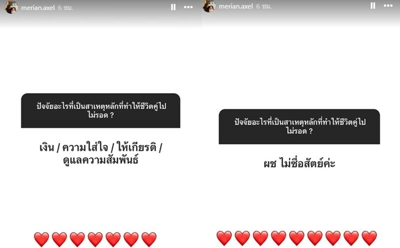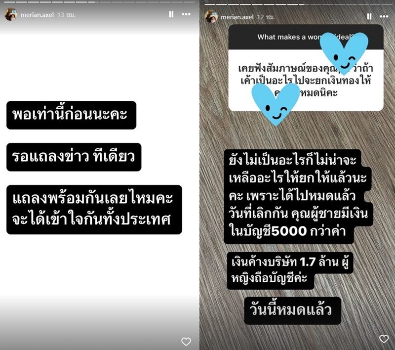 ขณะที่ มีเรียน ยังตอบคนถามด้วยว่า ขนาด พีเค ยังไม่เป็นอะไร ก็ไม่น่าจะเหลืออะไรยกให้แล้ว เพราะได้ไปหมดแล้ว วันที่เลิกกัน คุณผู้ชายมีเงินในบัญชี 5,000 กว่า เงินค้างบริษัท 1.7 ล้าน ผู้หญิงถือบัญชี วันนี้หมดแล้ว