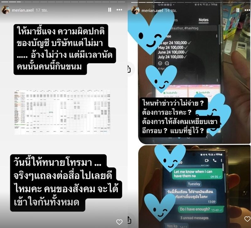 โดย มีเรียน หลังจากเปิดหลักฐานที่ไปตรวจสอบบัญชี แล้วพบว่า 2 ปี เงินบริษัท หายไป 10 ล้าน แล้วมีบัญชีม้าด้วย ทั้งยังบอกว่า ให้มาชี้แจงความผิดปกติบัญชีบริษัทก็ไม่มา ทั้งยังให้ทนายโทรมา และตั้งคำถามว่าไปให้ข่าวว่าไม่จ่าย ต้องการอะไร ต้องการเหยียบ พีเค อีกรอบแบบที่ขู่ไว้หรือ
