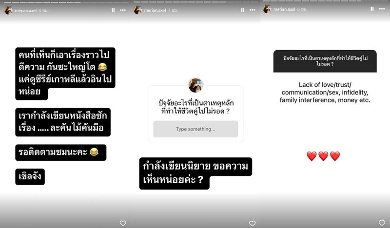 ล่าสุด มีเรียน ยังโพสต์ด้วยว่า คนที่เห็นก็เอาเรื่องราวไปตีความกันซะใหญ่โต แค่ดูซีรีส์เกาหลีแล้วอินไปหน่อย เรากำลังเขียนหนังสือสักเรื่อง ละคันไม้คันมือ รอติดตามชมนะคะ เขินจัง