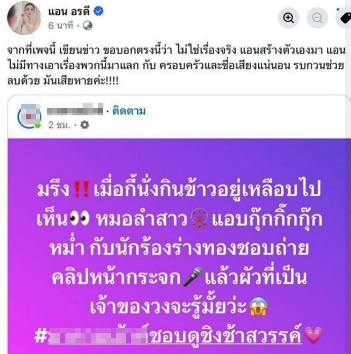 ซึ่งทางค่ายเพลงก็ออกมาขอโทษแอน อรดี และ อ้ายแมน โดยยอมรับว่ามีการสื่อสารคลาดเคลื่อน ทั้งนี้ แอน อรดี ก็ออกมาโพสต์เจ็บปวดเสียใจกับเรื่องที่ถูกโยงให้เสียหายทั้งที่ไม่ใช่ความจริง แม้จะมีการขอโทษแล้วก็ตาม เพราะตัวเองมีครอบครัวมีสามีและลูกๆ ชีวิตคู่ยึดหลักจะไม่ผิดศีลข้อ3 อยู่แล้ว