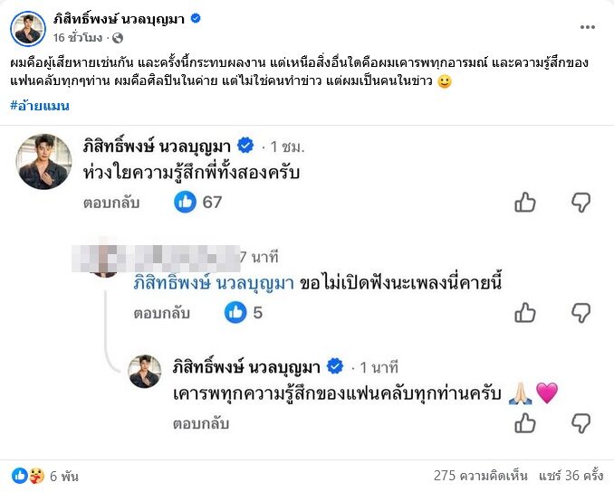 ขณะที่นักร้องหนุ่ม อ้ายแมน ภิสิทธิ์พงศ์ ก็แคปคอมเมนต์ที่โดนผลกระทบจากกระแสลือที่ไม่มีมูลความจริงเข้าแล้ว หลังมีคนประกาศไม่เปิดฟังเพลงค่ายนี้แล้วด้วย