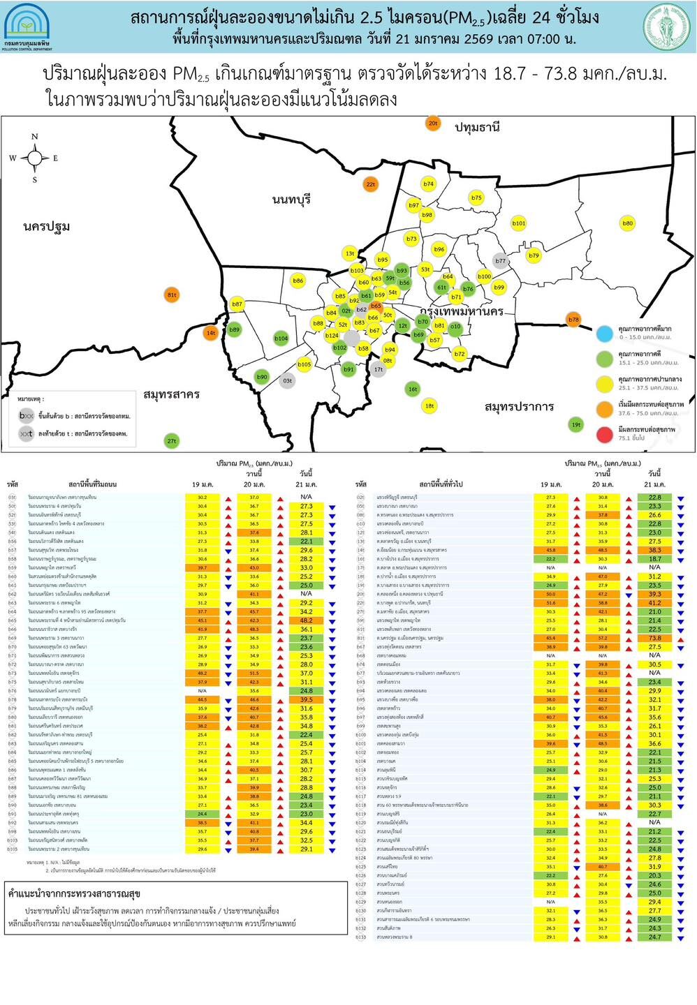 เมื่อเวลา 07.00 น. วันที่ 21 ม.ค.2569 ศูนย์สื่อสารการแก้ไขปัญหามลพิษทางอากาศ (ศกพ.) กรมควบคุมมลพิษ (คพ.) รายงานการติดตามตรวจสอบคุณภาพอากาศ ภาพรวมปริมาณฝุ่นละอองขนาดเล็กไม่เกิน 2.5 ไมครอน หรือ PM2.5 ในประเทศ ตรวจวัดค่าเฉลี่ย 24 ชม. วัดค่าฝุ่นได้ระหว่าง 7.5 – 73.8 ไมโครกรัมต่อลูกบาศก์เมตร (มคก./ลบ.ม.) ค่ามาตรฐานไม่เกิน 37.5 มคก./ลบ.ม.