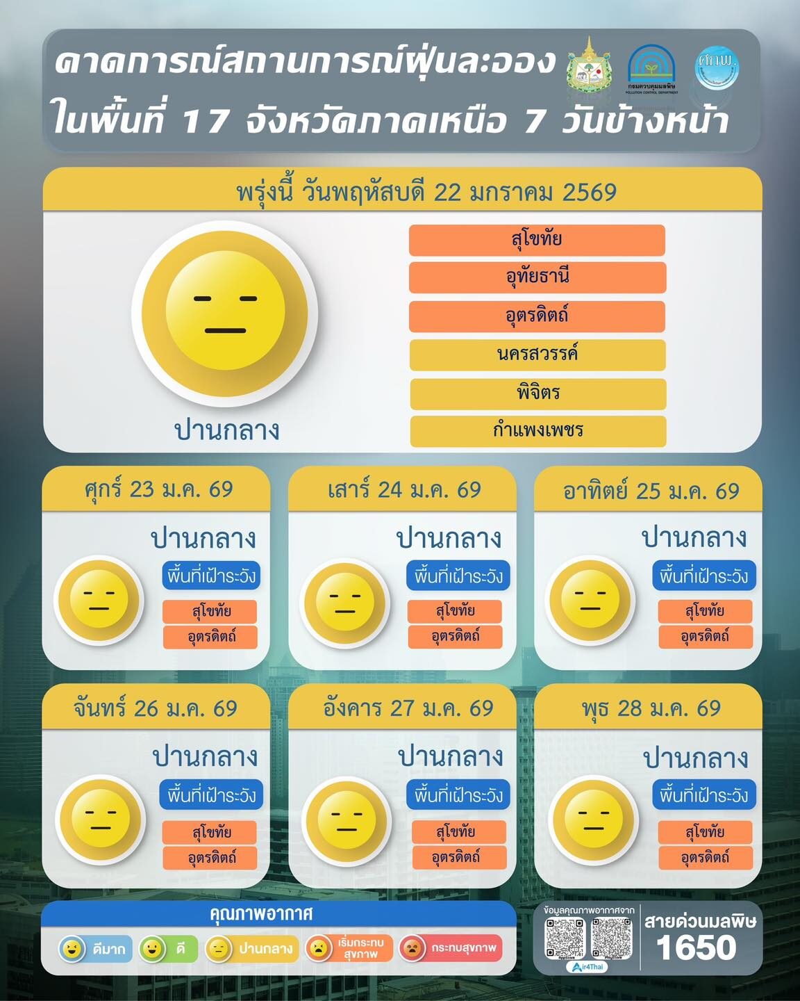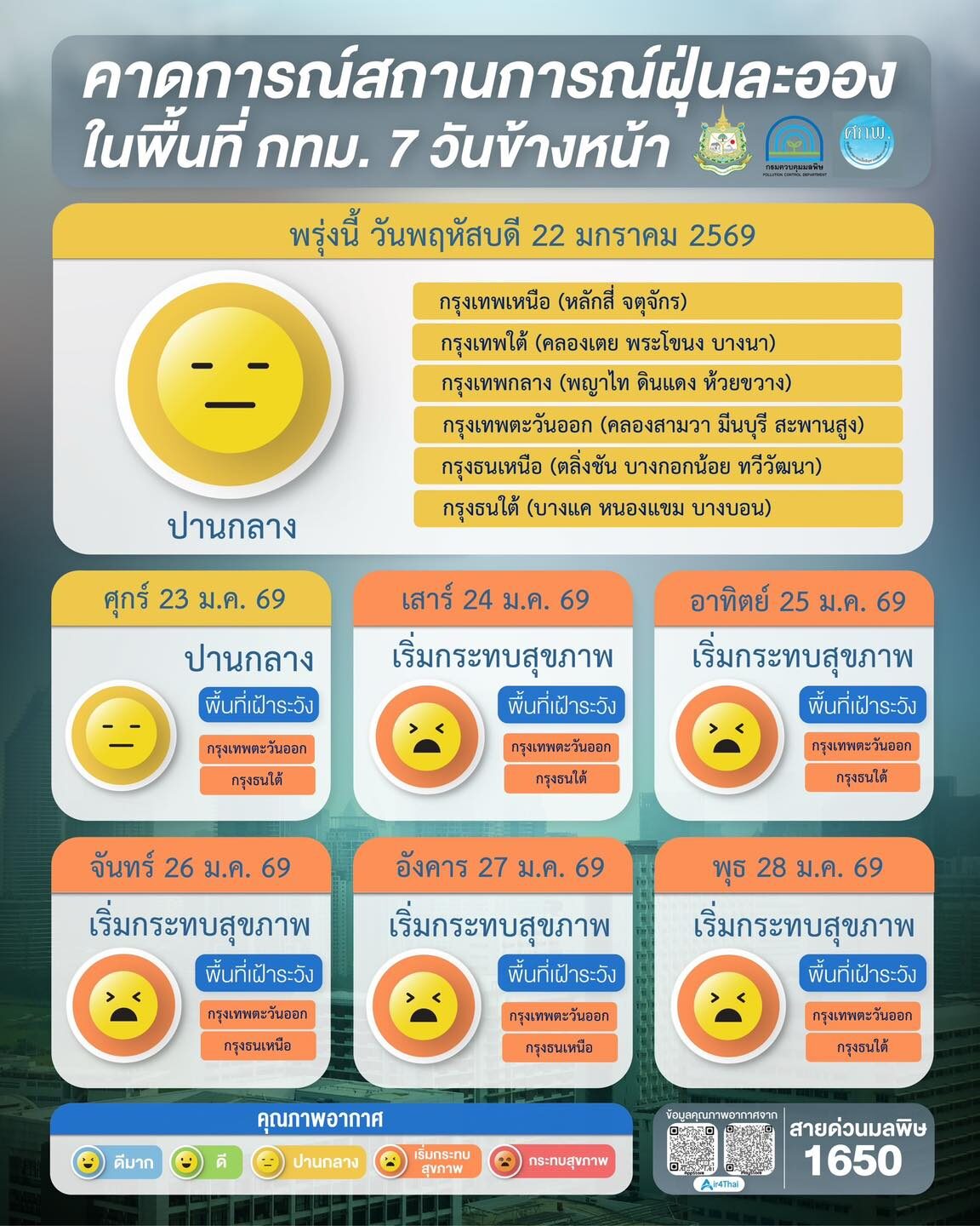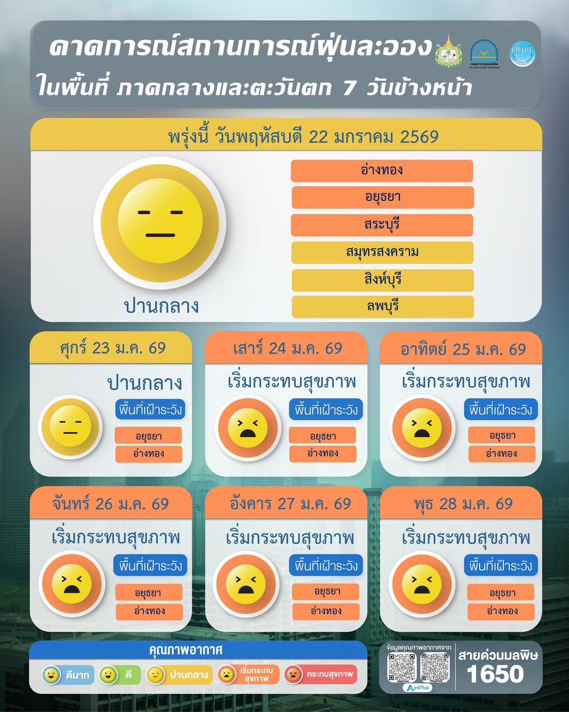 ผลการคาดการณ์สถานการณ์ฝุ่นละออง 7 วันข้างหน้า ระหว่างวันที่ 22–28 ม.ค. 2569