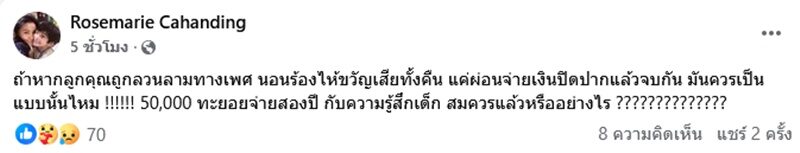 “ถ้าหากลูกคุณถูกลวนลามทางเพศ นอนร้องไห้ขวัญเสียทั้งคืน แค่ผ่อนจ่ายเงินปิดปากแล้วจบกัน มันควรเป็นแบบนั้นไหม !!!!!! 50,000 ทยอยจ่ายสองปี กับความรู้สึกเด็ก สมควรแล้วหรืออย่างไร ??????????????”