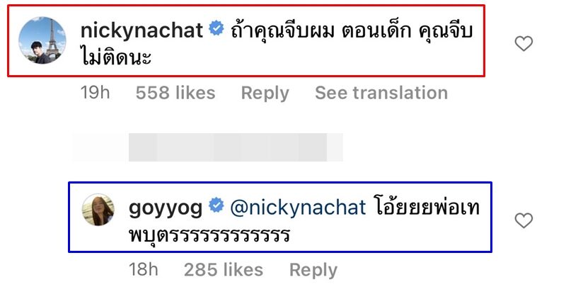ในขณะที่ หนุ่มนิกกี้ ไม่พลาดโอกาสเข้ามาแซวแฟนสาวเช่นกัน โดยบอกว่า “ถ้าคุณจีบผม ตอนเด็ก คุณจีบไม่ติดนะ” ซึ่ง สาวก้อย ได้ตอบกลับทันทีว่า “โอ้ยยยพ่อเทพบุตรรรร” เรียกว่าหยอกเอินกันตามประสาคู่รักอารมณ์ดีแหละเนอะ