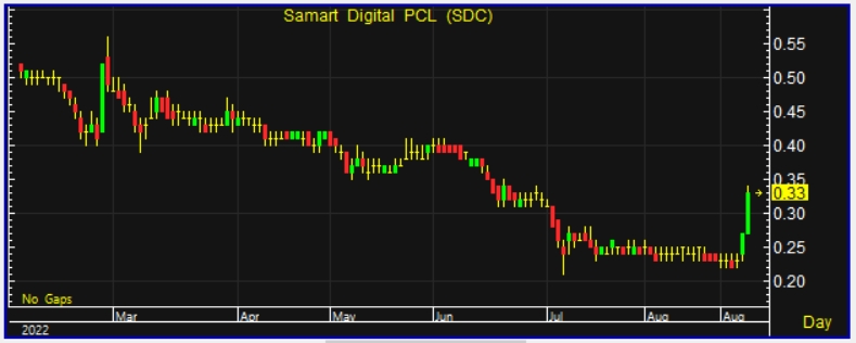 ผู้สื่อข่าวรายงานว่า วันนี้(29ส.ค.65)ราคาหุ้นบริษัท สามารถ ดิจิตอล จำกัด (มหาชน) หรือ SDC ณ เวลา 10.37 น. อยู่ที่ระดับ 0.33 บาท บวก 0.06 บาท หรือ 22.22% ราคาสูงสุด 0.34 บาท ราคาต่ำสุด 0.27 บาท ด้วยมูลค่าซื้อ 43.38 ล้านบาท ราคาหุ้นหุ้นปรับตัวแรงในรอบ 2 เดือน โดยนับตั้งแต่หุ้นยืนที่ระดับ 0.33 บาท เมื่อวันที่ 29 มิ.ย.65