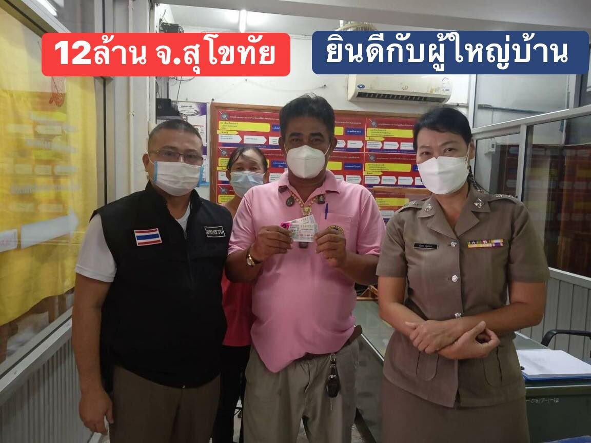 ล่าสุดในโลกออนไลน์ได้แชร์ภาพของเศรษฐีใหม่ป้ายแดงคนใหม่ เป็นผู้ใหญ่บ้าน ต.ปากแคว ต.เมืองสุโขทัย ซึ่งถูกรางวัลที่ 1 จำนวน 2 ใบ รอรับเงิน 12 ล้านบาท ก่อนผู้ใหญ่บ้านจะนำลอตเตอรี่มาลงบันทึกประจำวันที่โรงพัก ท่ามกลางตำรวจและชาวบ้านที่ทราบข่าวมาแสดงความยินดีกับผู้ใหญ่บ้านท่านนี้