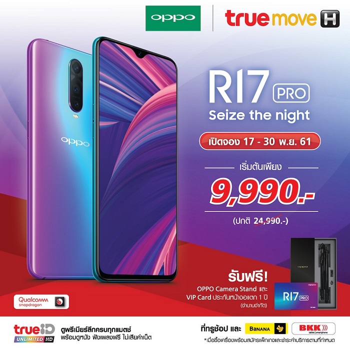 truemove H เปิดจอง OPPO R17 Pro สำหรับลูกค้าที่ pre-booking รับส่วนลดค่าเครื่องสูงสุด 15,000 บาท เหลือเพียง 9,990 บาท จากราคาเครื่องปกติ 24,990 บาท เมื่อสมัครแพ็กเกจ 4G+ FUN Unlimited 1299 และชำระค่าบริการรายเดือนล่วงหน้า 8,000 บาท สามารถลงทะเบียนเป็นเจ้าของ OPPO R17 Pro ได้ตั้งแต่วันที่ 17 – 30 พฤศจิกายน 2561 นี้ ที่ทรูช้อปสาขาที่ร่วมรายการ และรับเครื่องได้ตั้งแต่วันที่ 1-10 ธันวาคม 2561 ที่ทรูช้อปสาขาที่เลือกไว้
