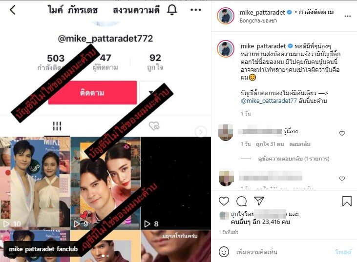 พอดีมีพี่ๆน้องๆหลายท่านส่งข้อความมาแจ้งว่ามีบัญชีติ๊กตอกใช้ชื่อของผม มีไปคุยกับคนนู้นคนนี้ อาจจะทำให้หลายๆคนเข้าใจผิดว่านั่นคือผม บัญชีติ๊กตอกของไมค์มีอันเดียว —> @mike_pattaradet77 อันนี้นะค้าบ