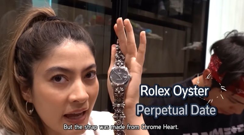 ส่วนอีกเรือนที่ป๊อกใส่บ่อย แต่เป็นของมาร์กี้ซื้อมาใส่เอง เป็น Rolex Oyster Perpetual Date แต่สาย Chrome Heart ทำขึ้นมาใหญ่จนมาร์กี้ใส่ไม่ได้ ตัดข้อออกแล้วก็ยังไม่ได้ เลยเป็นของป๊อกไปโดยปริยาย ไม่ได้เป็นของขวัญอะไร
