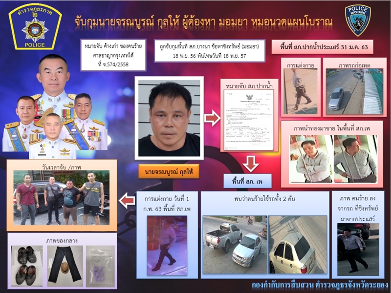 จากการสืบสวนพบว่า ผู้ก่อเหตุทั้ง 2 คดี คือ นายจรณบูรณ์ กุลให้ อายุ 46 ปี ชาวจ.อุตรดิตถ์ ซึ่งเคยถูกจับในพื้นที่ สภ.บางนา กรุงเทพฯ เมื่อปี 2562 โดยใช้วิธีการแบบเดียวกับ 2 คดีดังกล่าวนี้ ประกอบกับผู้เสียหาย ทั้ง 2 คดี ยืนยันว่าผู้ก่อเหตุ คือ นายจรณบูรณ์ตามภาพถ่าย เจ้าหน้าที่ตำรวจจึงได้รวบรวมพยานหลักฐานและศาลจังหวัดระยองได้อนุมัติหมายจับ จนนำไปสู่การจับกุมคนร้ายดังกล่าว