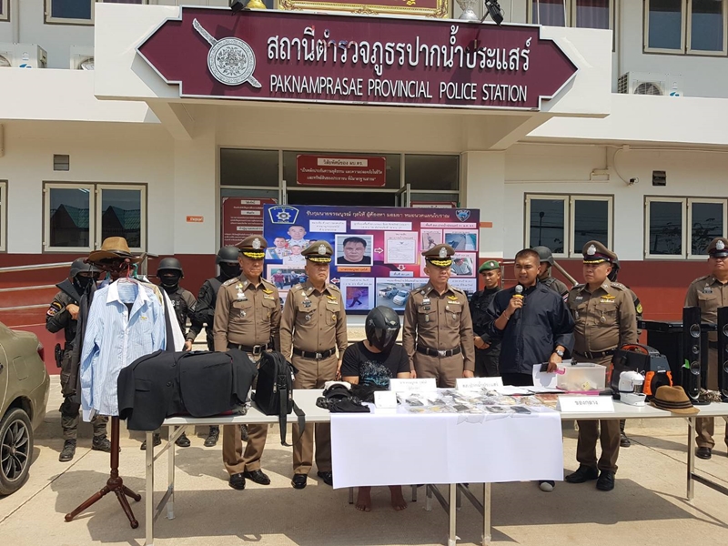 โดยสามารถจับกุมได้ที่บริเวณภายในถนนสุขุมวิท 54/2 แขวงบางจาก เขตพระโขนง กรุงเทพฯ พร้อมของกลาง 1.รถยนต์ ยี่ห้อโตโยต้า วีออส ทะเบียน กฉ-3512 จันทบุรี ซึ่งผู้ถูกจับได้ชิงทรัพย์มาจาก นางมาลี ปลื้มผล ร้านนวดพื้นที่สภ.ปากน้ำประแสร์ 2.รถยนต์ ยี่ห้อโตโยต้า โคโรลล่า สีเทา ฐร-8121 กทม. ที่ใช้ในการก่อเหตุ 3.หมวกปีกที่ใส่ก่อเหตุ จำนวน 1 ใบ 4.กางเกงขายาวสีดำที่ใส่ก่อเหตุ 1 ตัว 5.รองเท้าหนังสีดำ ที่ใส่ก่อเหตุ 1 คู่ และ 6.เครื่องแต่งกายที่ใช้ก่อเหตุคดีอื่น ๆ อีกจำนวน หนึ่ง