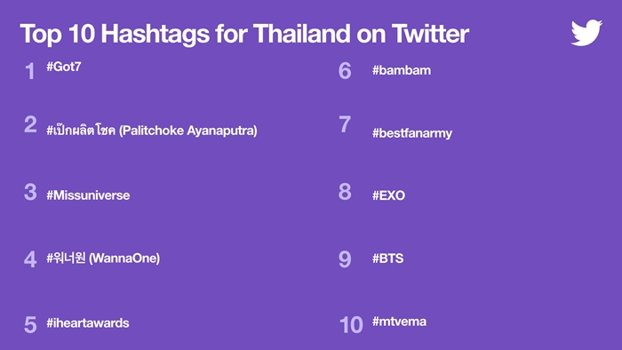 5. K-pop ดันการใช้งาน Twitter ในไทยมาแรง โดย Twitter Trend 10 อันดับในช่วง 12 เดือนที่ผ่านมา พบว่ามากกว่าครึ่งเป็นกระแสเกี่ยวกับ “K-pop” สะท้อนให้เห็นว่า คนไทยชื่นชอบ K-pop โดย Hashtag ยอดนิยม ได้แก่