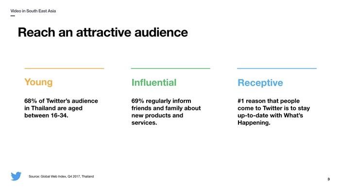 Arvinder Gujral ขยายความเพิ่มเติมว่า โซนเอเชีย-แปซิฟิค และโซนเอเชียตะวันออกเฉียงใต้ ประชากรกลุ่มที่กำลังโตเร็วคือ ชาวมิลเลนเนียล ทำให้เป็นฐานผู้ใช้งานใหญ่ของ Twitter ซึ่งถือเป็นเรื่องดีสำหรับแพลตฟอร์มเรา เนื่องจากแบรนด์ต่างๆ ให้ความสนใจผู้บริโภคกลุ่มนี้เช่นกัน