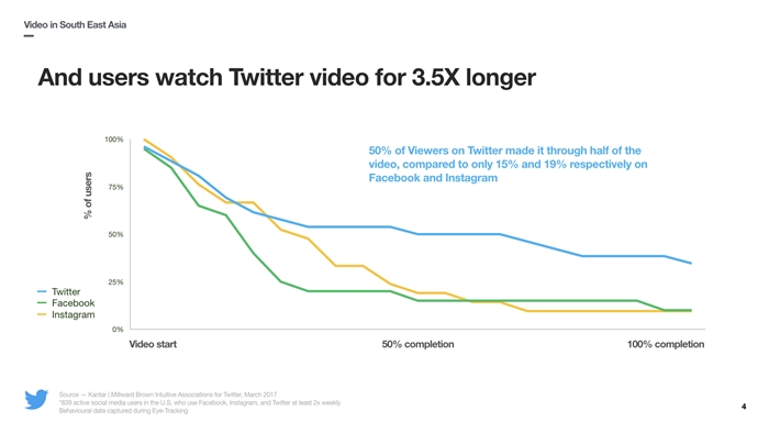 Arvinder Gujral เล่าว่า จากการวิจัยการดูวิดีโอ เทียบระหว่าง Twitter กับ Social Media แพลตฟอร์มอื่น พบว่าคนดูวิดีโอบน Twitter นานกว่า 3.5 เท่า (ทั้งวิดีโอทั่วไป และวิดีโอโฆษณา) ที่เป็นเช่นนั้นเพราะการใช้ Twitter ผู้ใช้งานเป็นคนเลือกว่าอยากเห็น อยากติดตามในสิ่งที่เขาสนใจ ดังนั้นวิดีโอที่แสดงขึ้นมาบนหน้า Twitter ของคนๆ นั้น จึงเป็นสิ่งที่เขาสนใจอยู่แล้ว ประกอบกับคนใช้ Twitter มีทัศนคติเปิดรับ