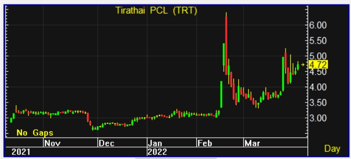 ผู้สื่อข่าวรายงานว่าวันนี้ (31 มี.ค. 2565) ราคาหุ้นบริษัท ถิรไทย จำกัด (มหาชน) หรือ TRT ณ เวลา 11:15 น. อยู่ที่ระดับ 4.72 บาท เพิ่มขึ้น 0.22 บาท หรือ 4.89% โดยทำจุดสูงสุดที่ 4.82 บาท และทำจุดต่ำสุดที่ 4.54 บาท ด้วยมูลค่าการซื้อขาย 156.61 ล้านบาท