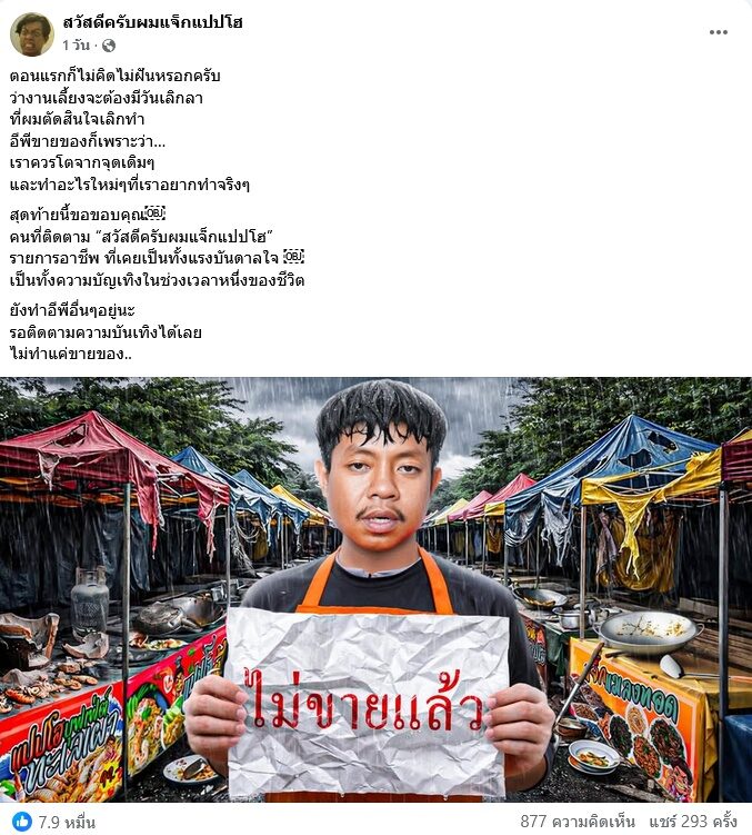 ไม่รู้ว่าเกิดอะไรขึ้น แจ็กแปปโฮ โพสต์ภาพตัวเองในตลาด ข้อความ ไม่ขายแล้ว พร้อมประกาศแจ้งแฟนๆด้วยว่า “ตอนแรกก็ไม่คิดไม่ฝันหรอกครับ ว่างานเลี้ยงจะต้องมีวันเลิกรา ที่ผมตัดสินใจเลิกทำอีพีขายของก็เพราะว่า… เราควรโตจากจุดเดิมๆ และทำอะไรใหม่ๆที่เราอยากทำจริงๆ”